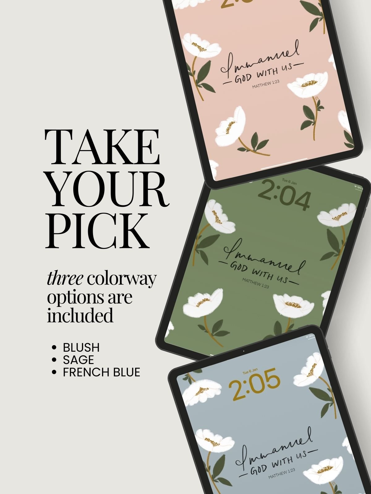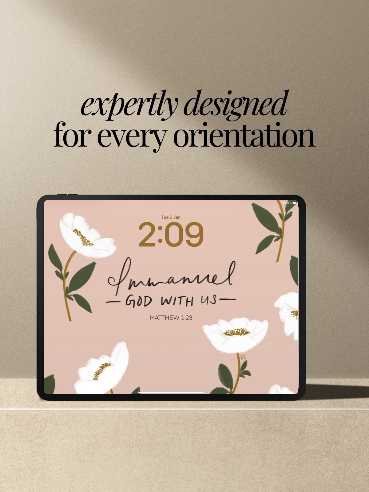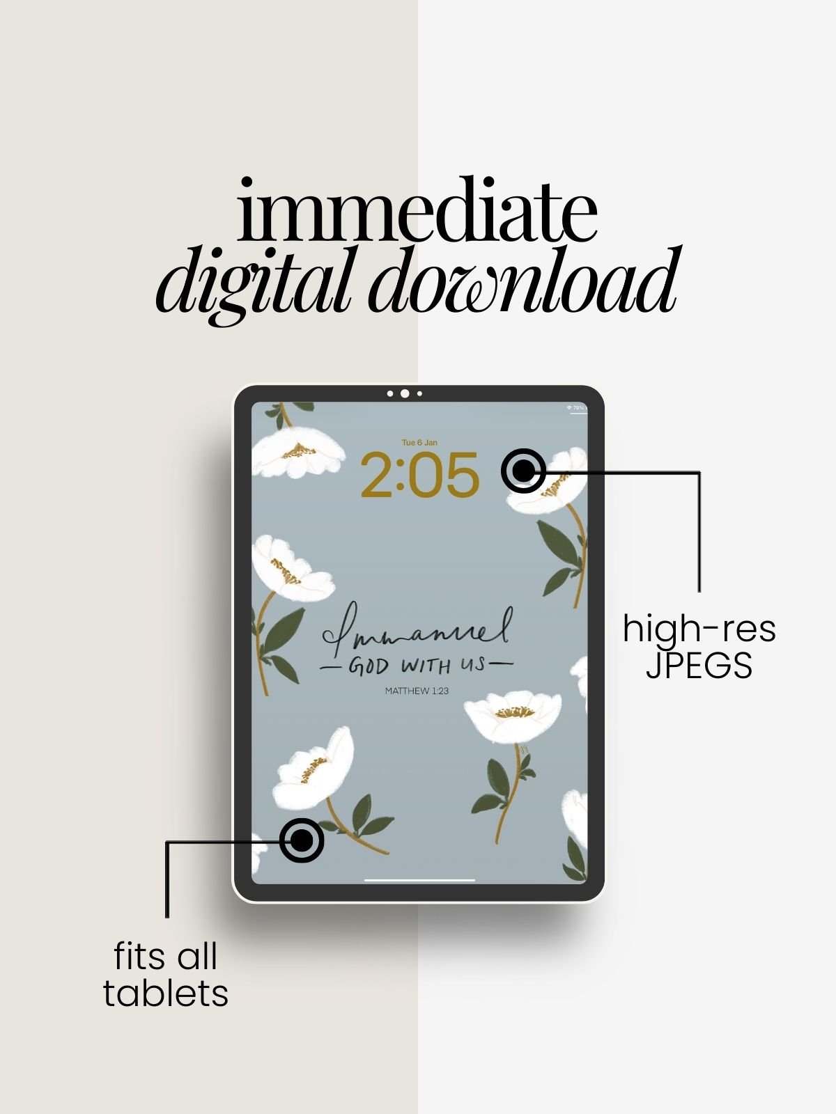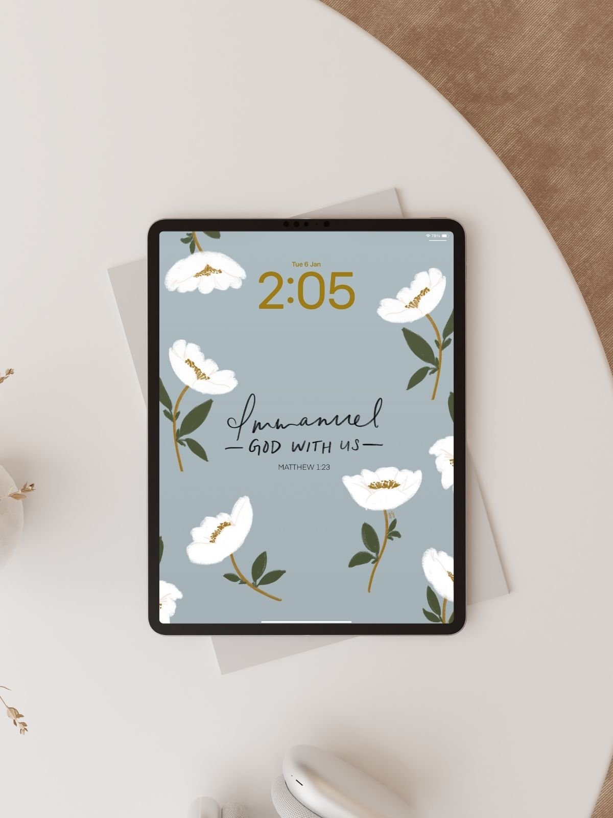 The Immanuel iPad Wallpaper Set features the popular Bible verse from Matthew 1:23. Each high-resolution digital file is designed to fit every tablet size and suit any orientation you turn your device. The Wallpaper set makes for a quick and easy update to your lock screen or home screen.