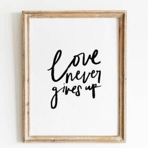 Delight in modern and minimalist art at home with the Love Never Gives Up Faith Art Print featuring original hand lettering of the popular New Testament Scripture: